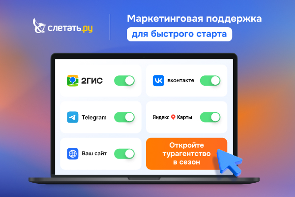 Сосредоточьтесь на главном — продажах. Остальное мы возьмём на себя. Каждому новому партнёру мы предлагаем полный digital‑пакет для максимально эффективного старта при открытии турагентства Слетать.ру: